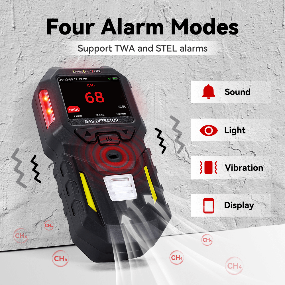 Метод сигнализации: визуальные и звуковые сигналы тревоги, мигание значка на дисплее и вибрационная сигнализация; поддержка оповещения о падении, сигнализации TWA/STEL.