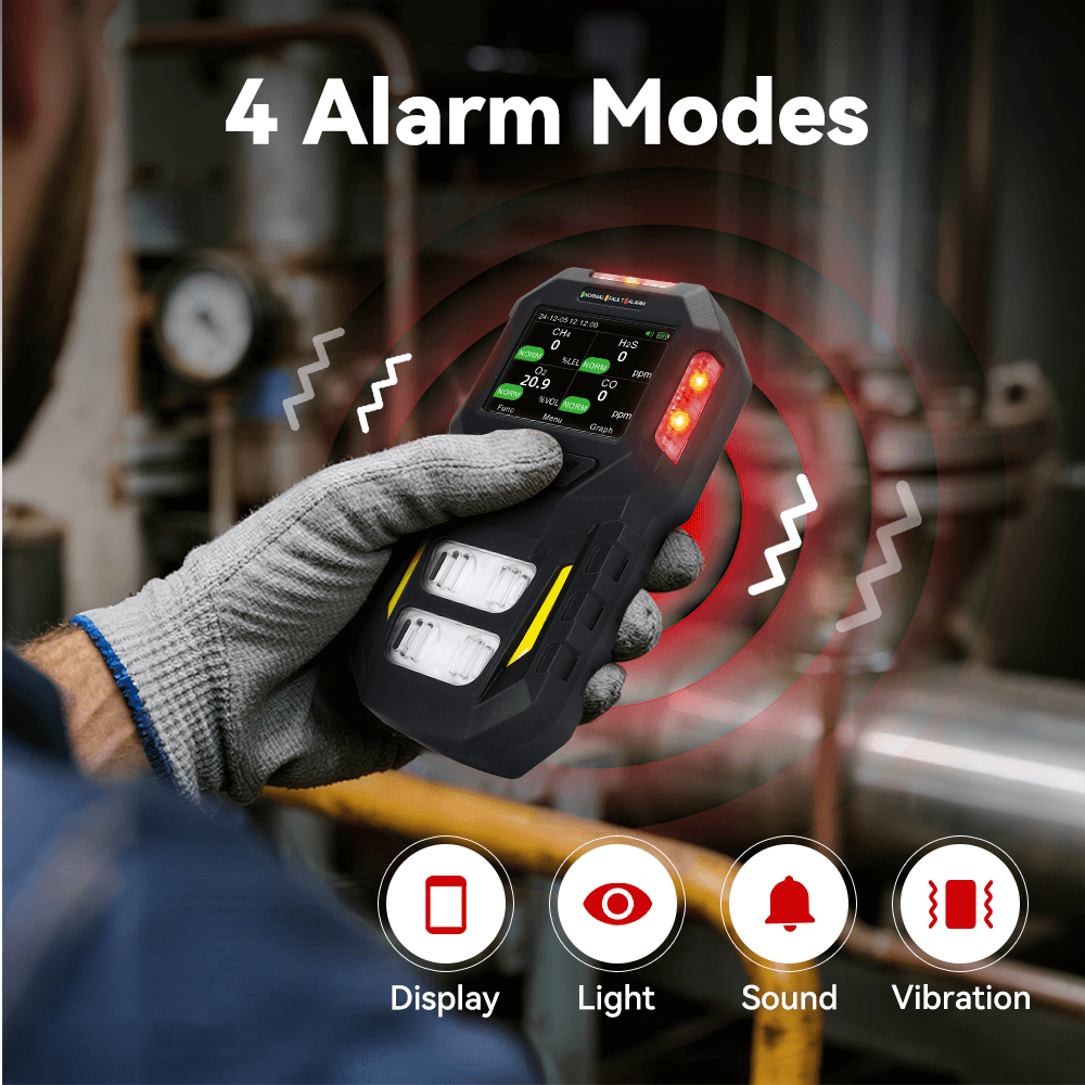 Метод сигнализации: визуальная и звуковая сигнализация, мигание значка на дисплее и вибрационная сигнализация; поддержка оповещения о падении, оповещения TWA/STEL.